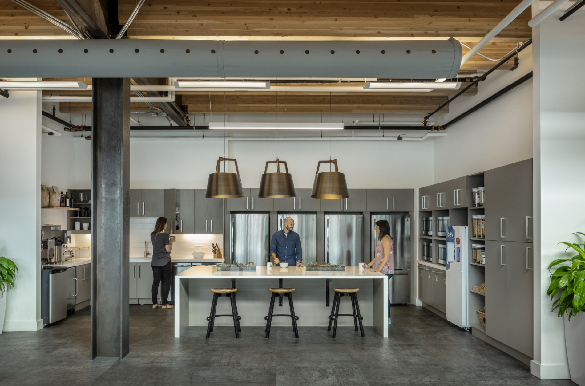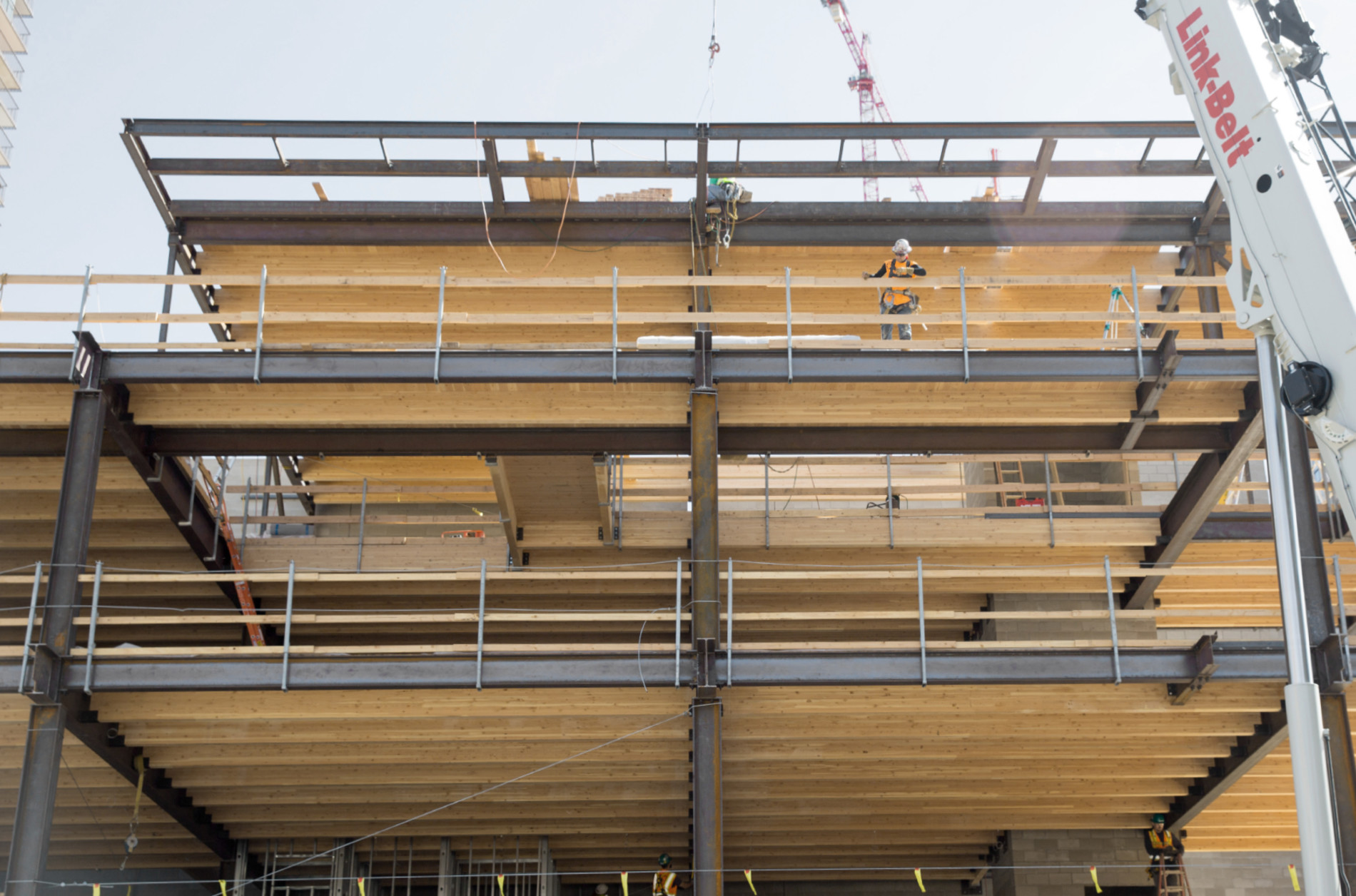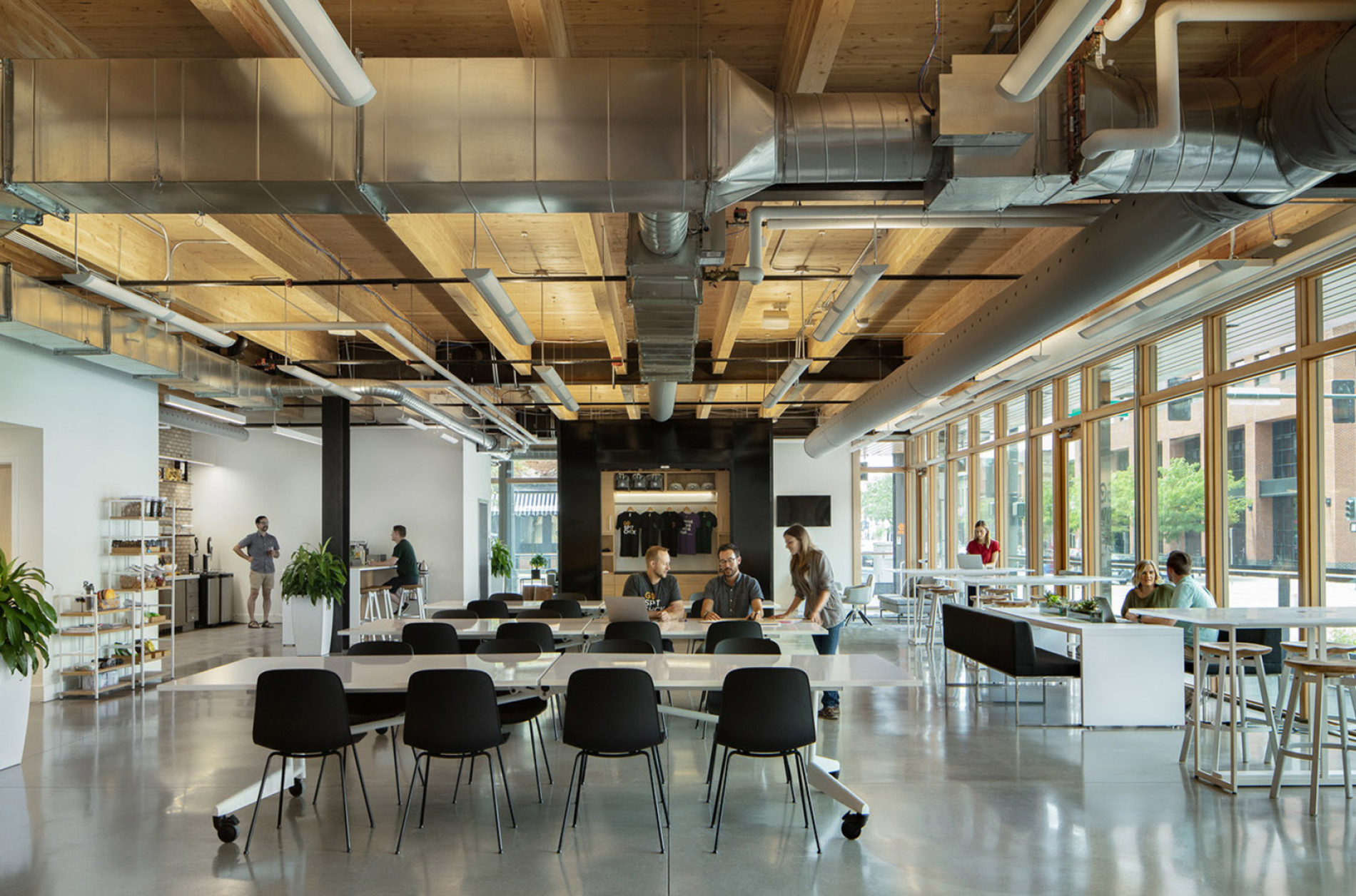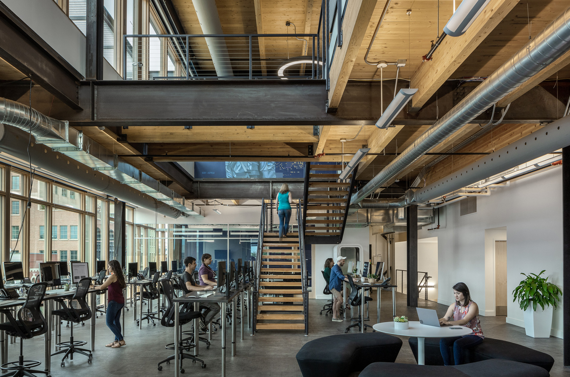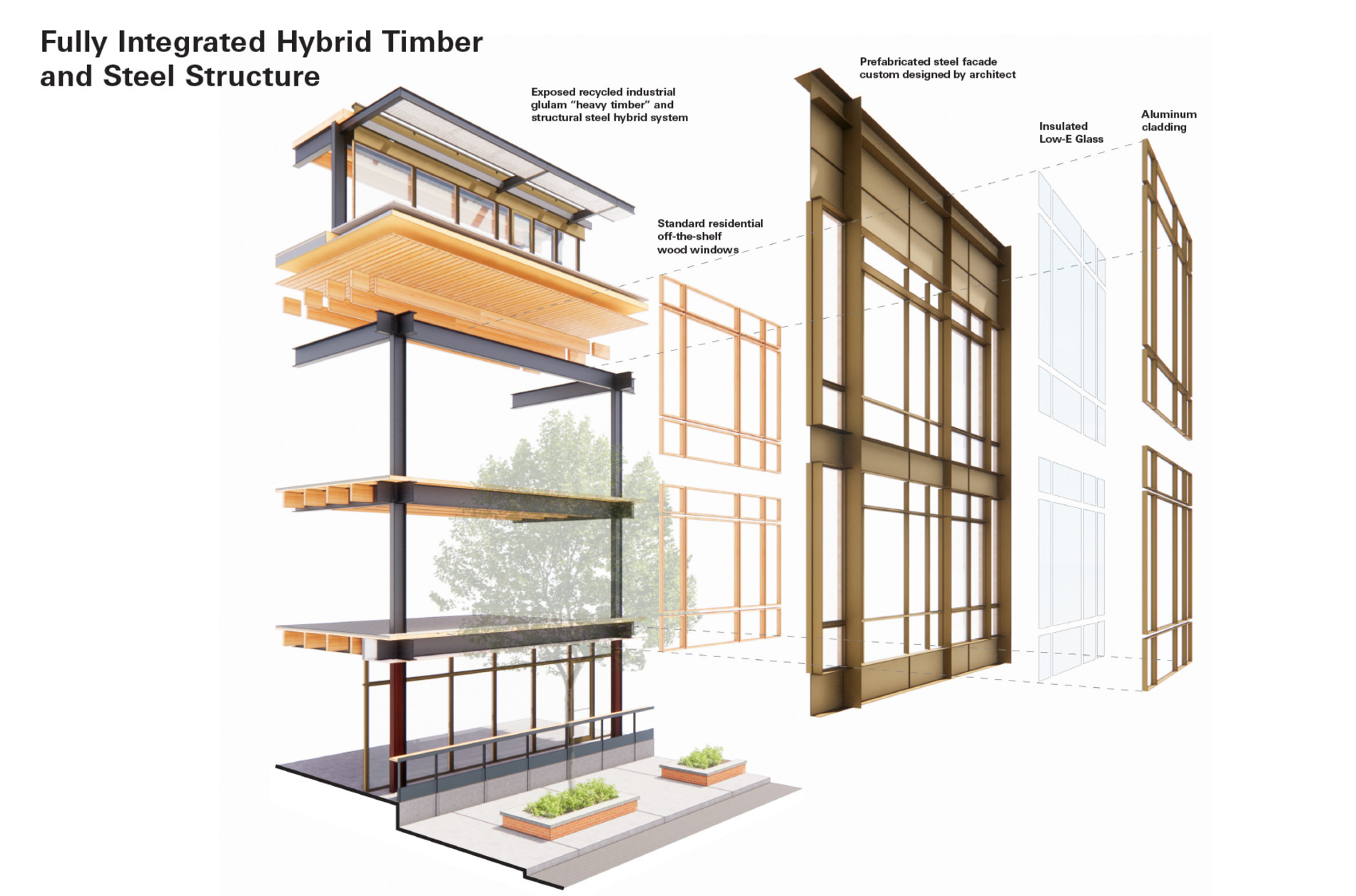 The interior of exposed structural wood glulams and wood decking pays homage to the exposed structure of the adjacent historic Seed Building. The exterior is composed of a custom steel curtain wall system with aluminum-clad wood windows.