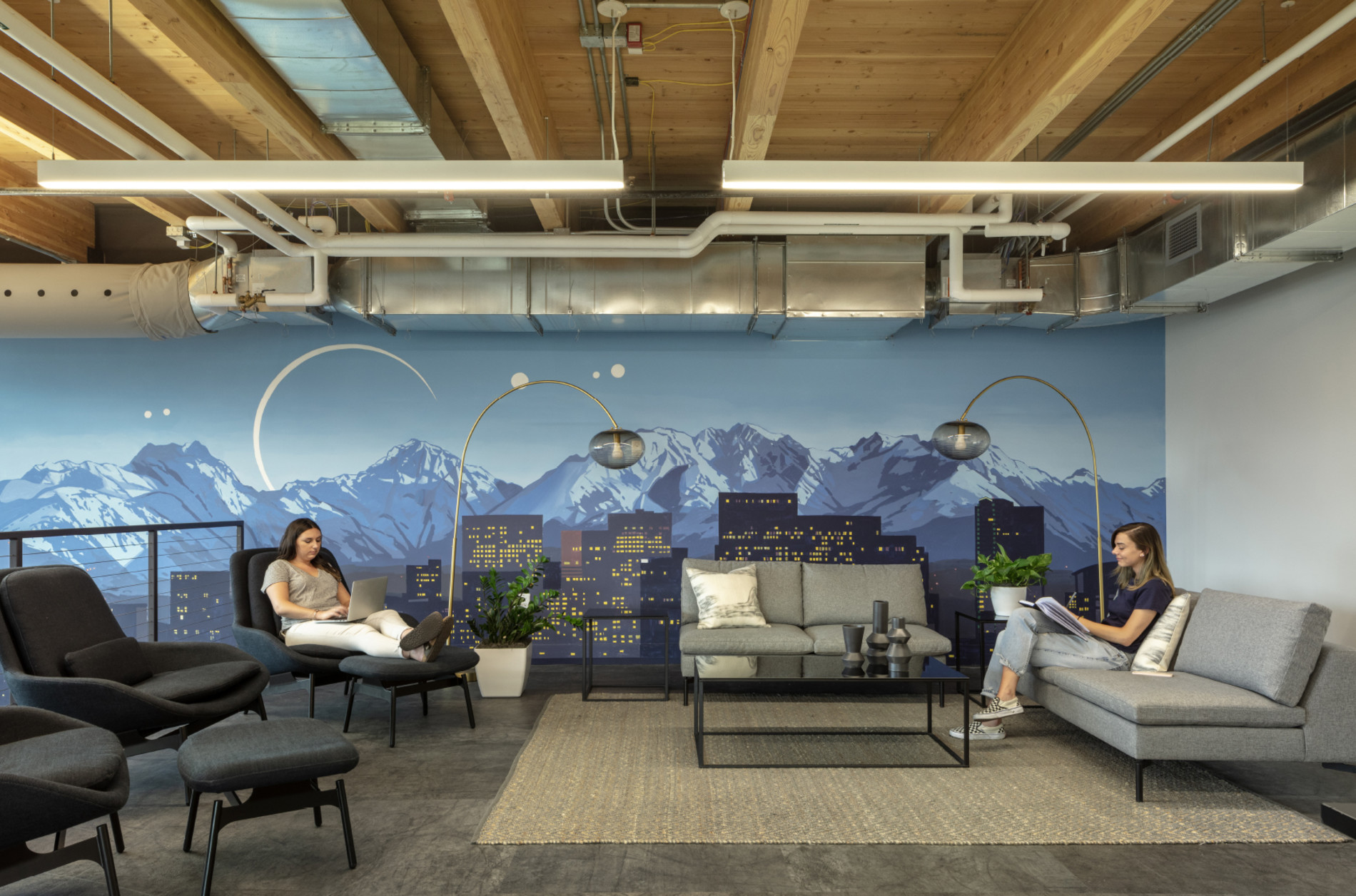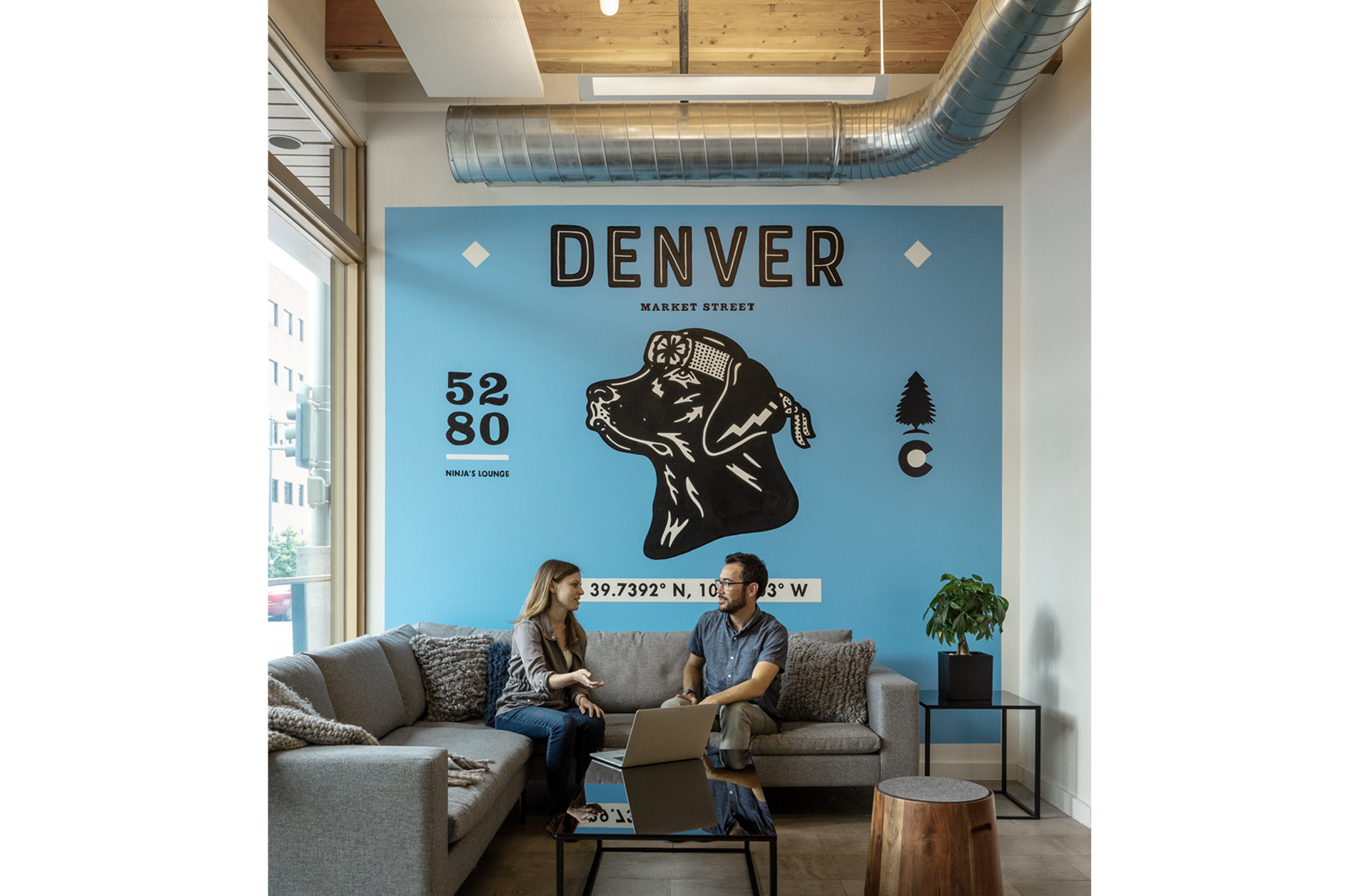 The roof terrace provides GoSpotCheck employees with expansive views of the Rocky Mountains and downtown Denver.