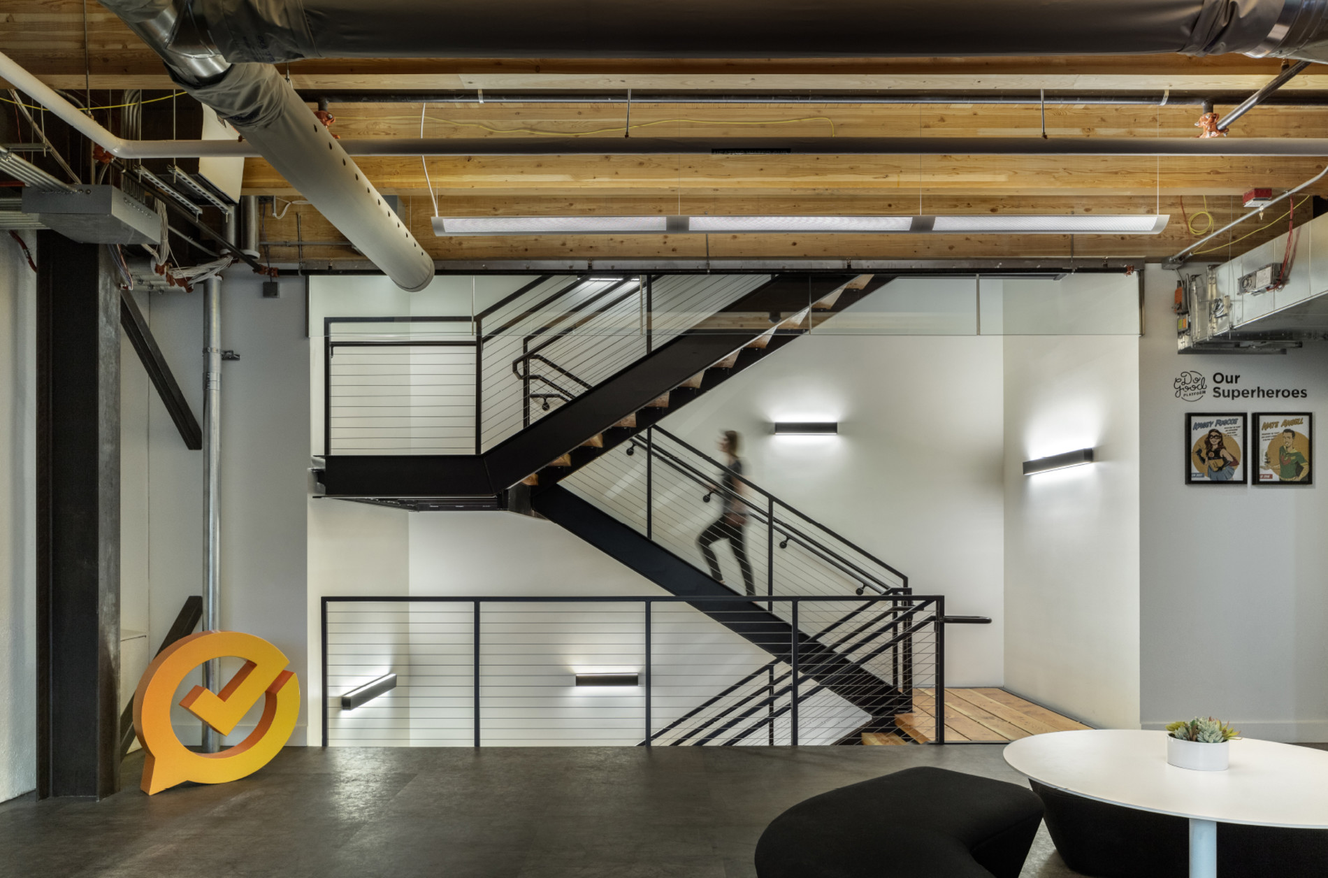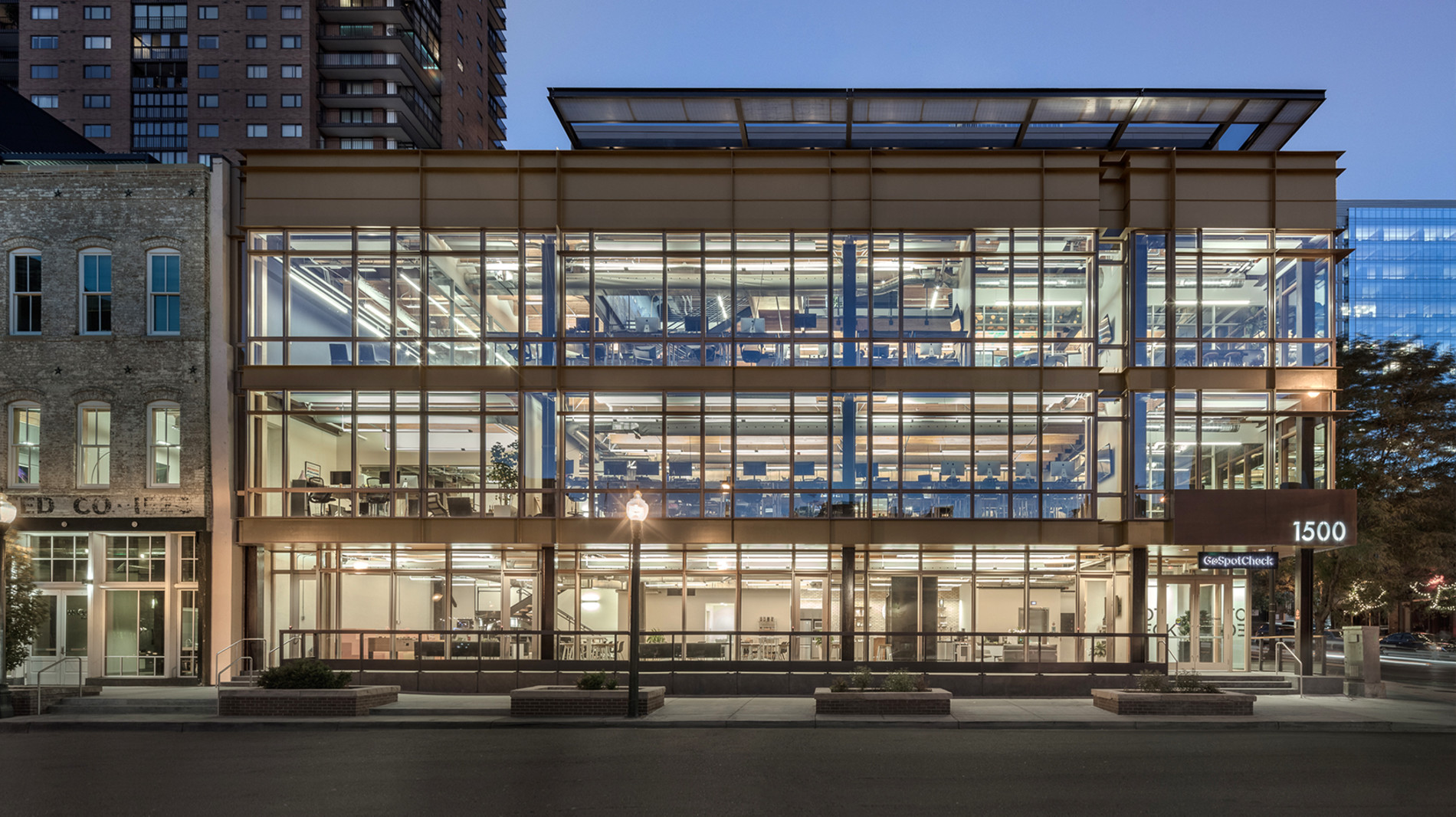 The GoSpotCheck Headquarters at 1500 Market is a new, three-story plus top-floor mezzanine addition to the historic Rocky Mountain Seed Building at 1520 Market. The new structure is built on top of the below-ground, 24-vehicle parking structure constructed in 2014.