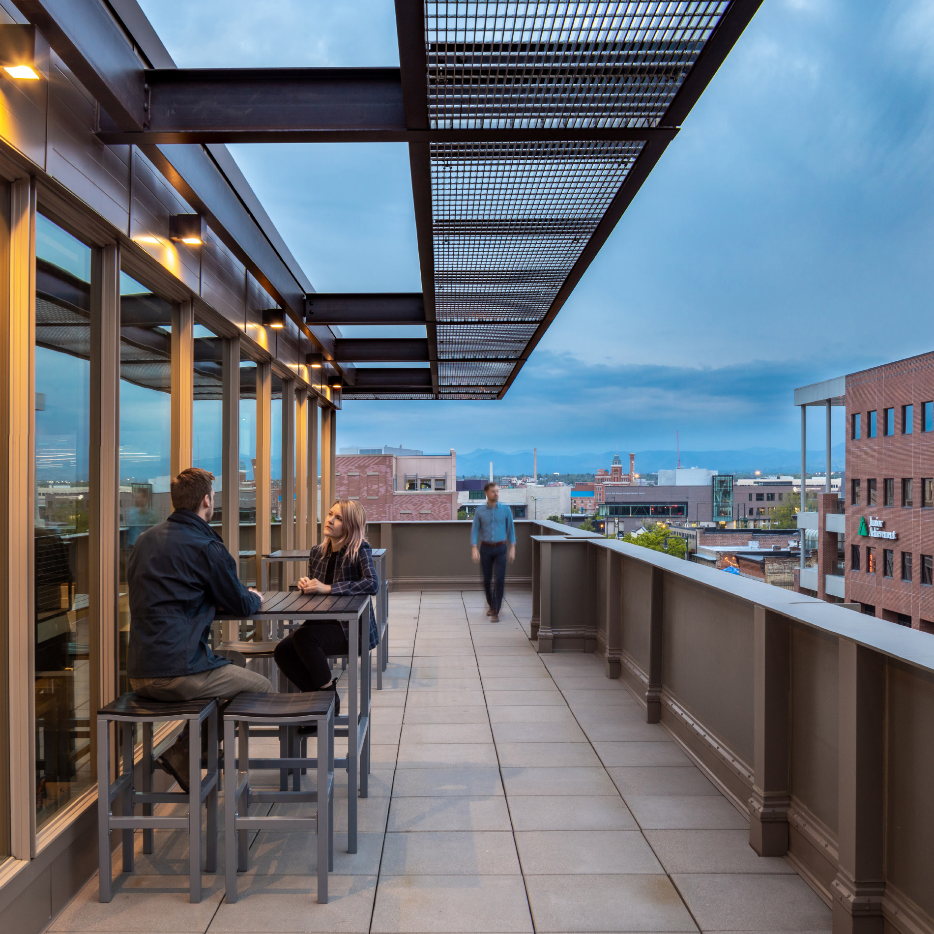 The building completes the street wall on the south-east corner of 15th and Market. Floors 2 and 3 include 5,000 SF of office with interior connections to the Seed Building. The top-floor mezzanine features an L-shaped deck with views through LoDo to the Rocky Mountains beyond.