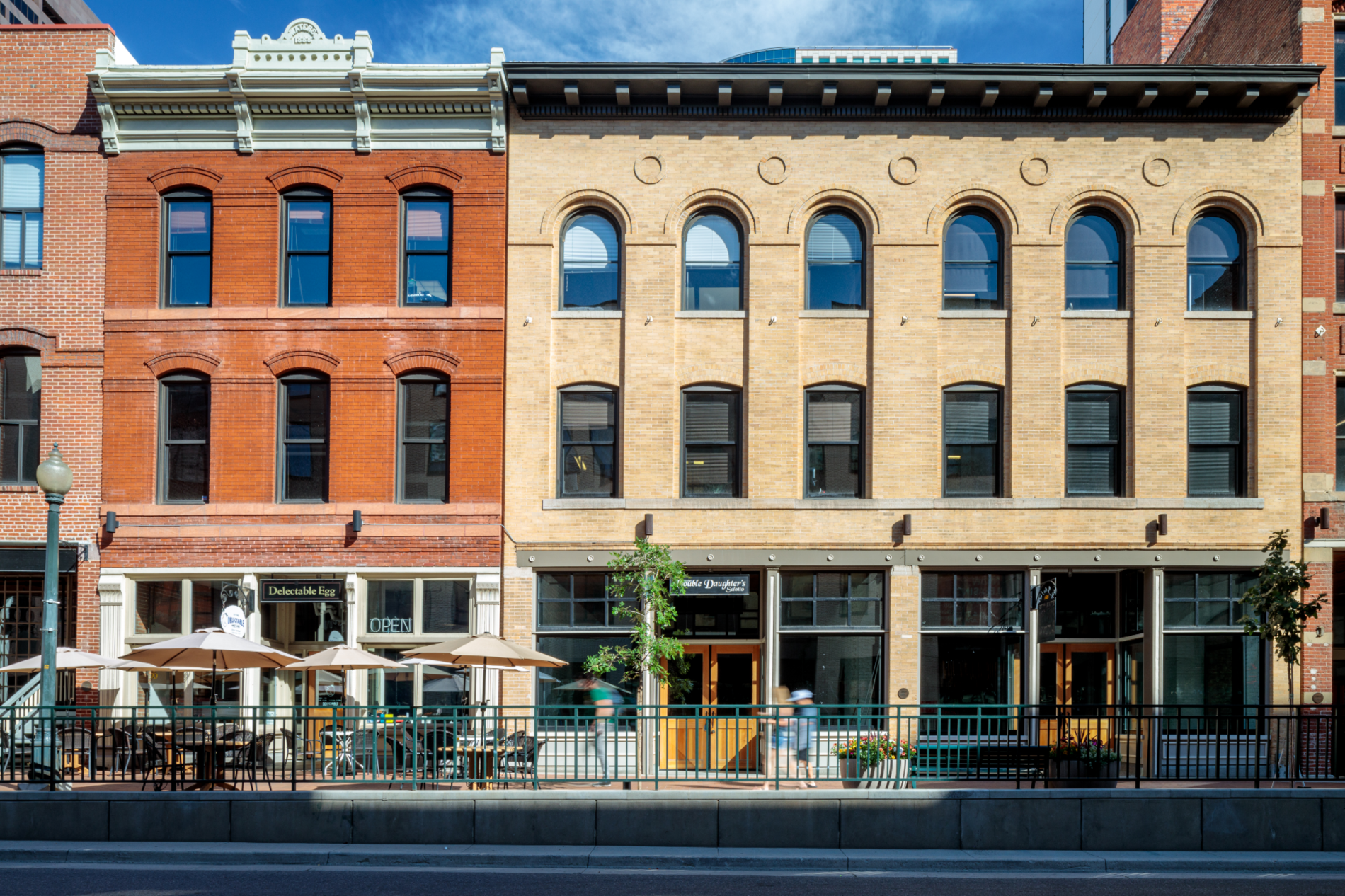Tryba Architects was enlisted to restore and revitalize the dreary structures, bringing new life to the streetscape in the process. The new renovation filled in the voids, returning the windows to their historic placement and appearance while also introducing new operability that would expand the space and create seamless connection between indoors and outdoors. Office tenant experience was enhanced through the addition of new conference facilities, bike storage rooms, and a repositioned lobby. Inside and out, the transformation beautifully showcases Denver's past and creates a dynamic and inviting experience for building users and passerby.
