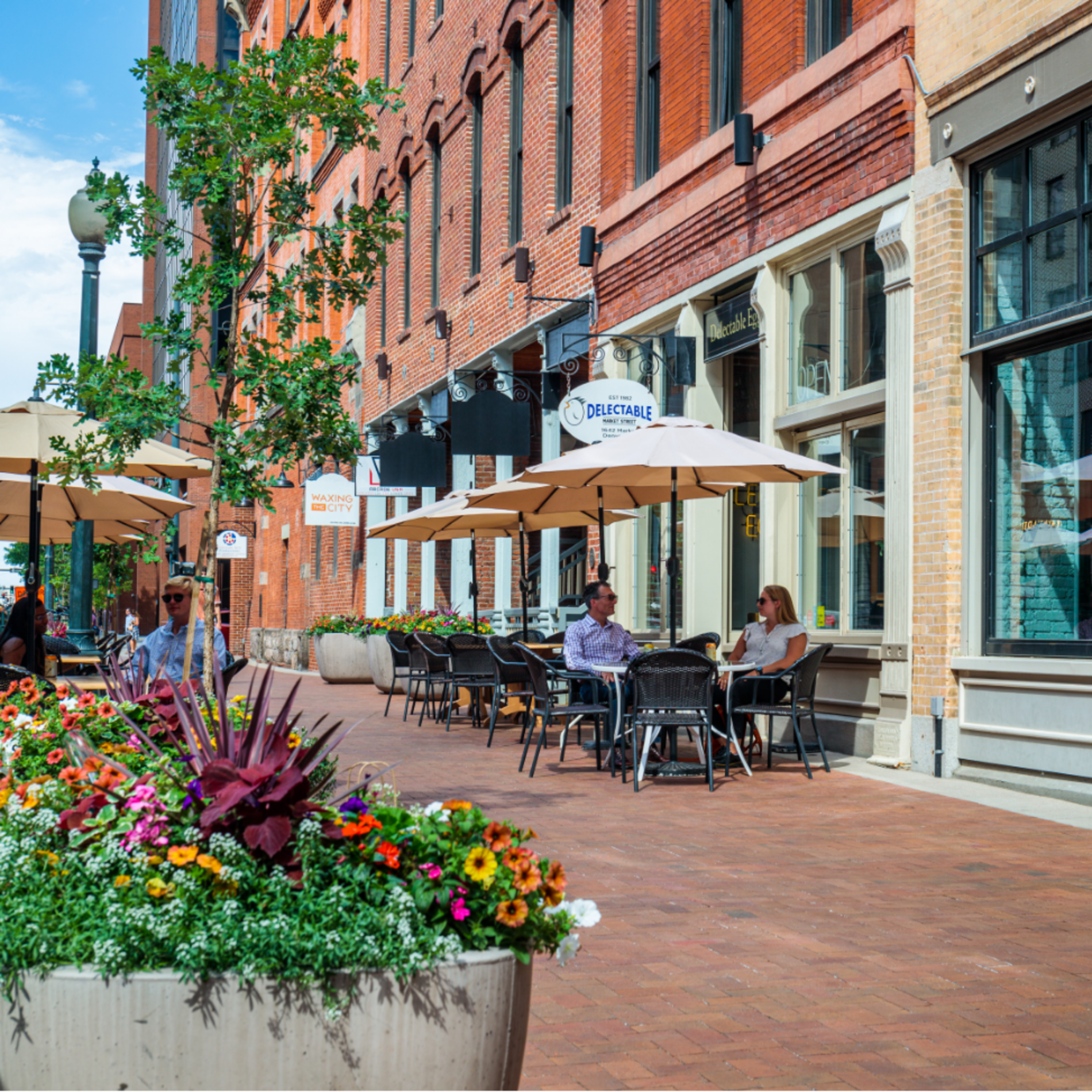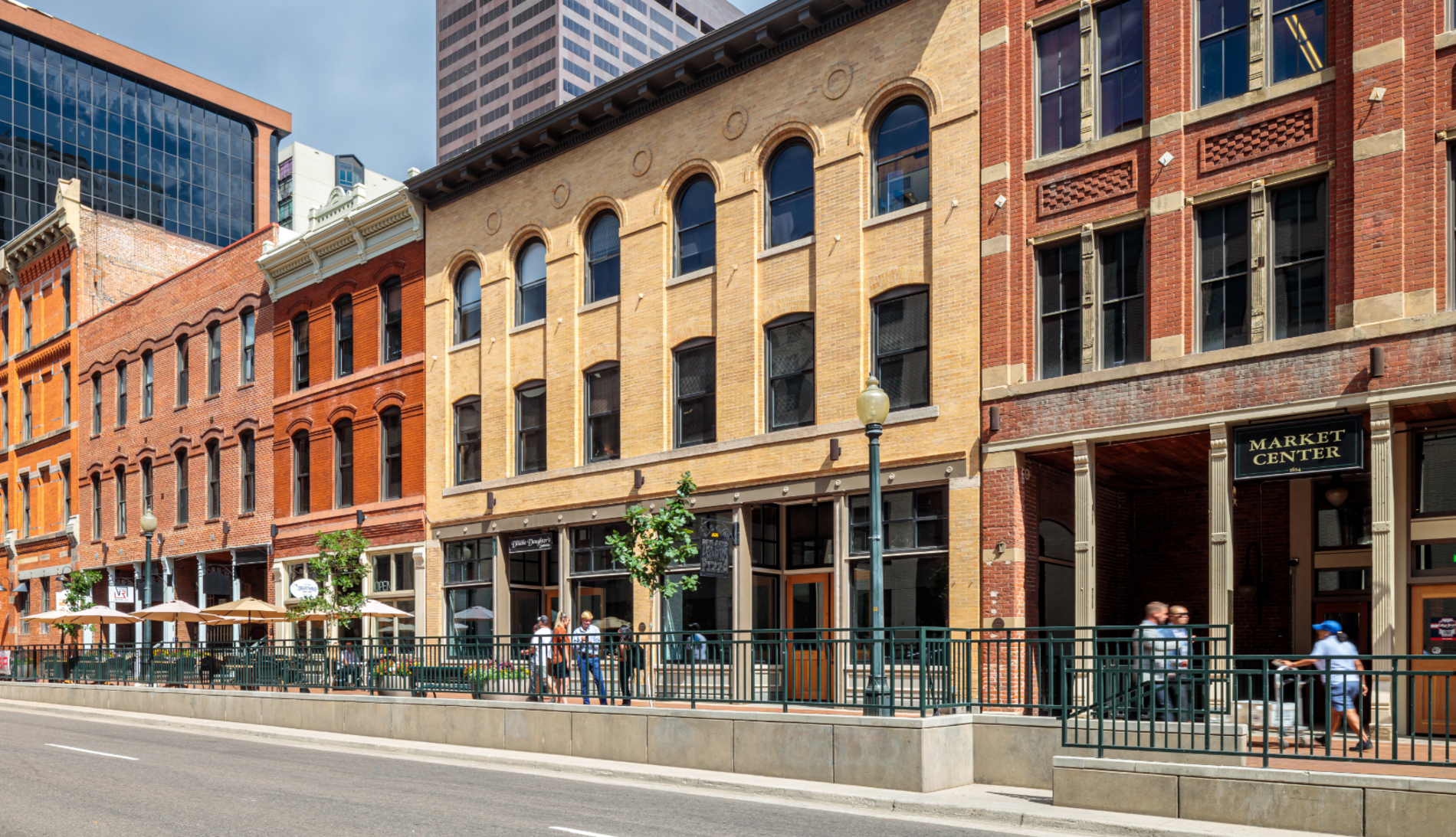 Market Center is a row of five brick buildings, built between 1872 and 1902, along Market Street in Denver's historic LoDo neighborhood. The buildings were linked in the 1970s to support ground-floor retail and upper-story office suites, but this reconstruction awkwardly pushed the retail storefronts back from the sidewalk to accommodate basement stair access—resulting in dark, uninviting recesses where once had been active storefronts.