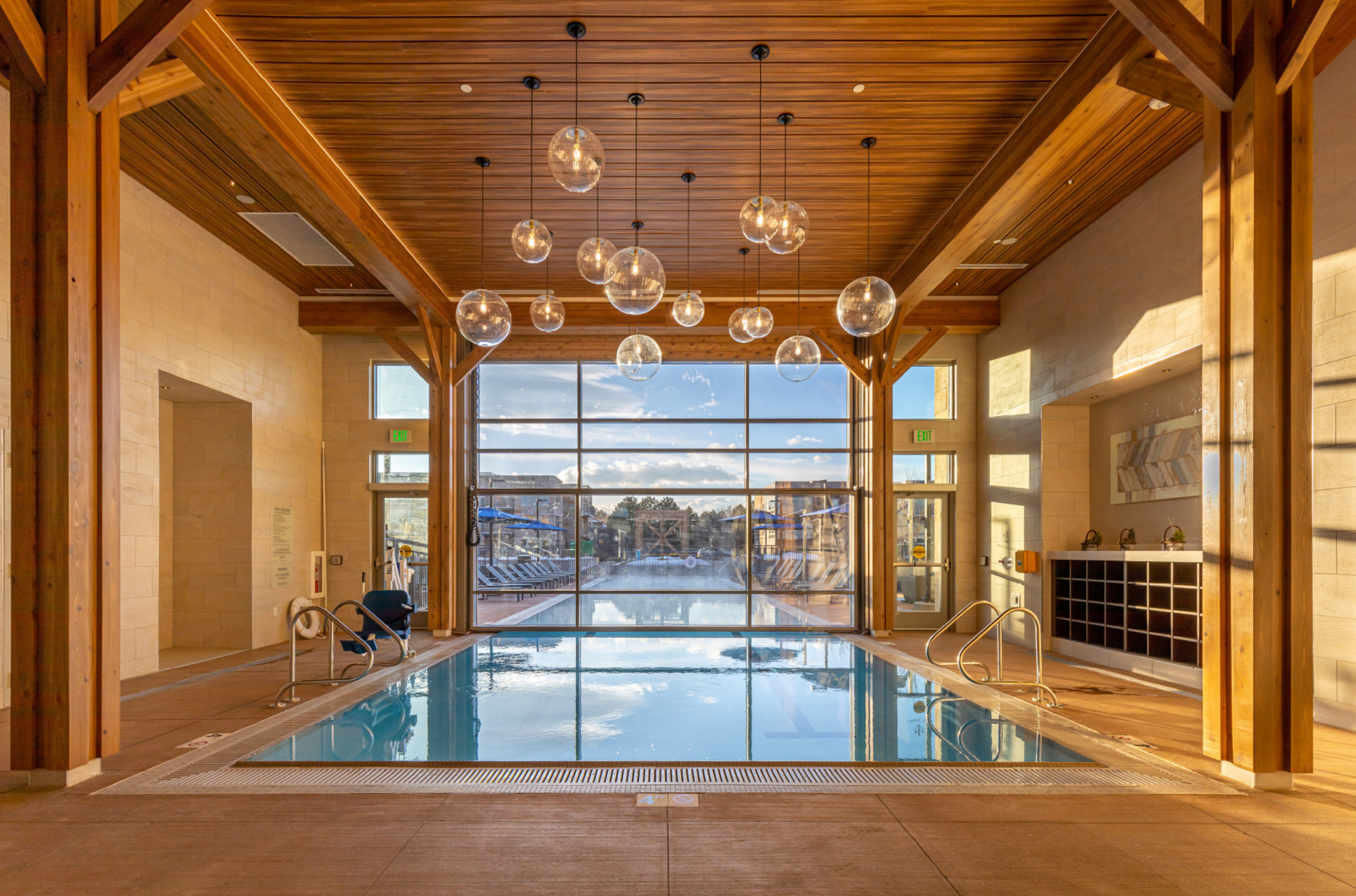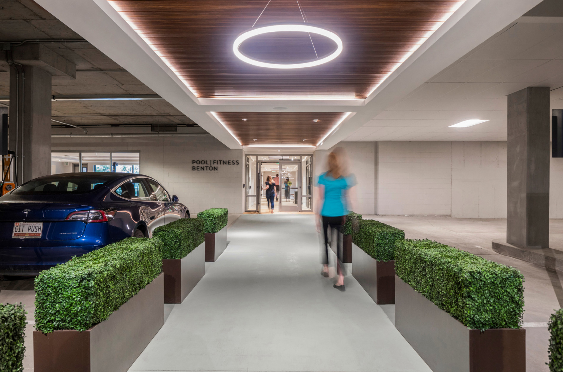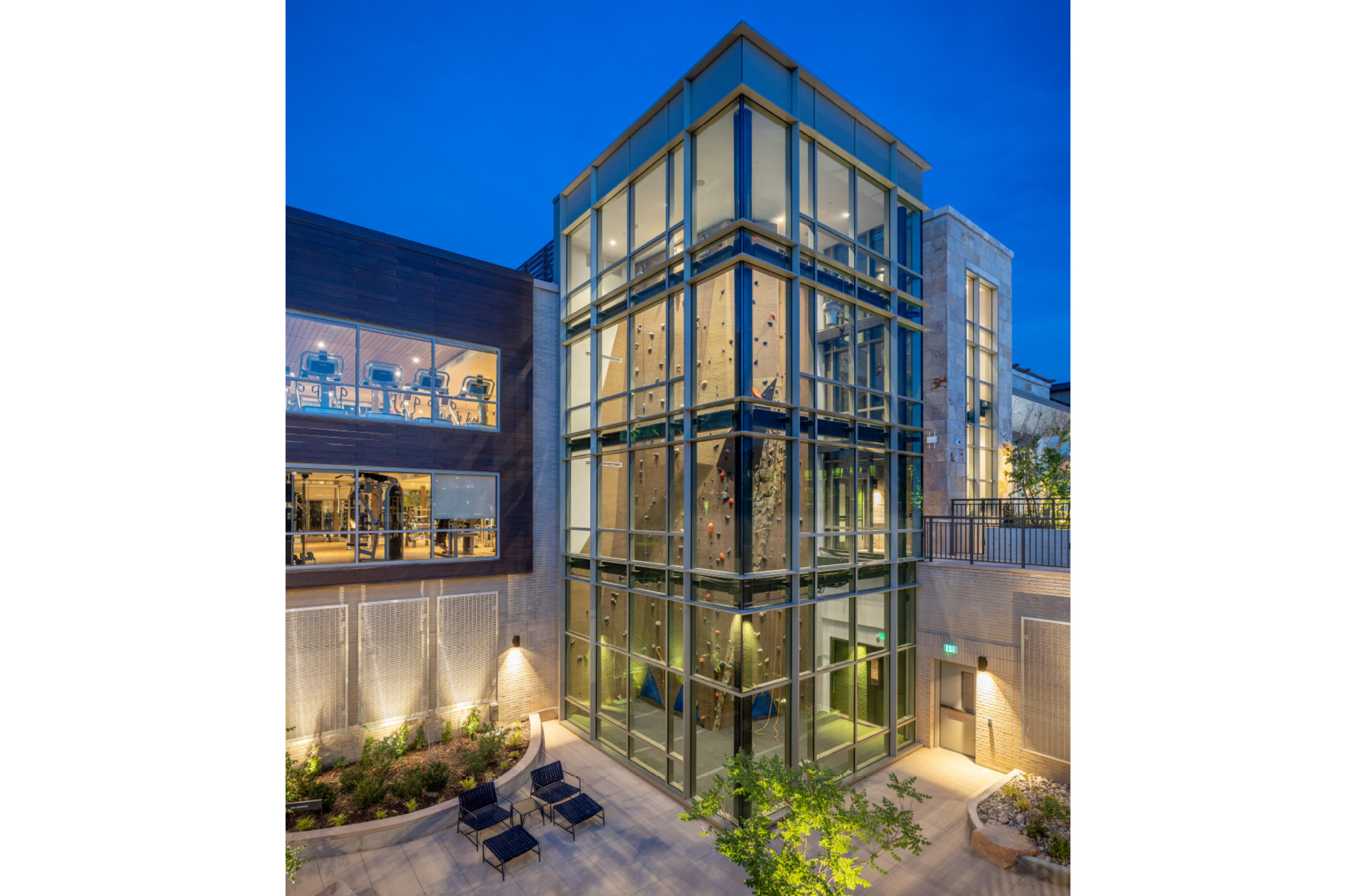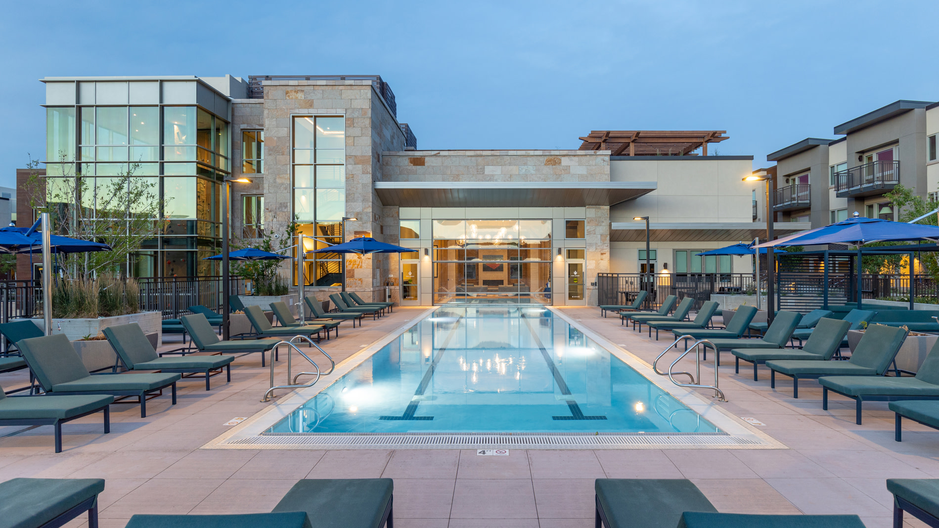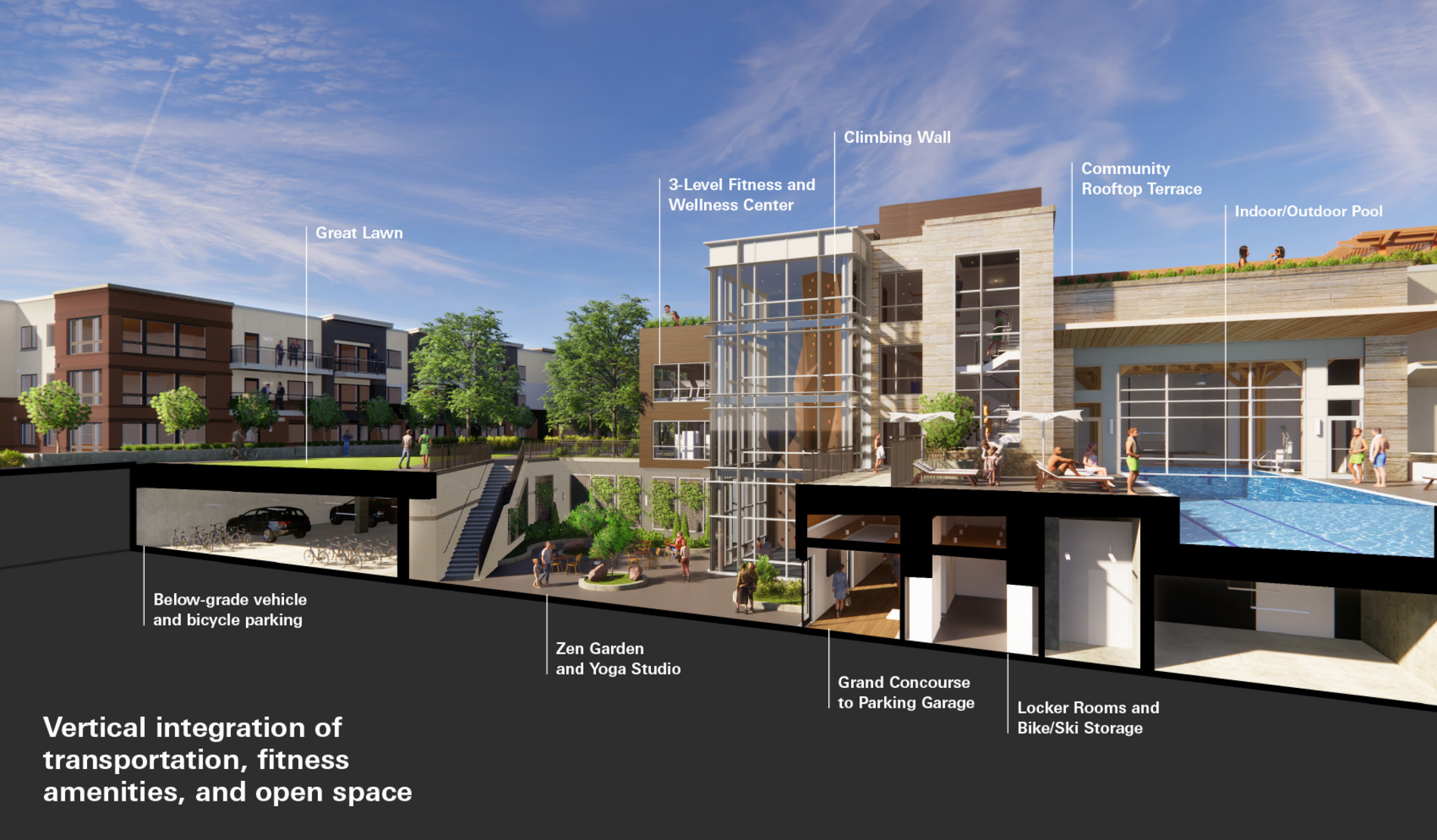 A Zen Garden allows natural light into the below-grade 295-car parking structure. Resident amenities include a fitness center with climbing wall, multiple lounges, a yoga room, bike storage and an innovative indoor/outdoor pool.