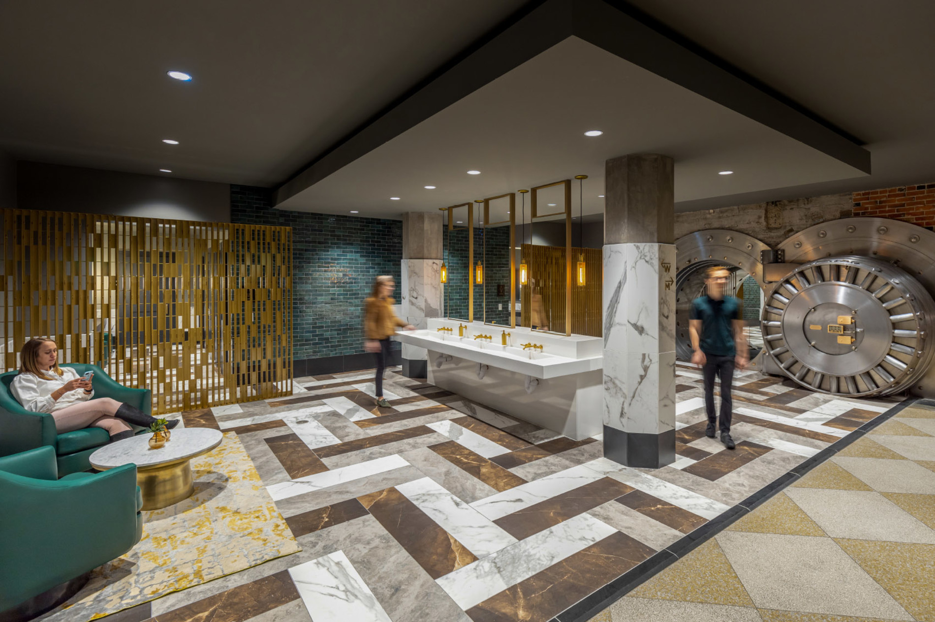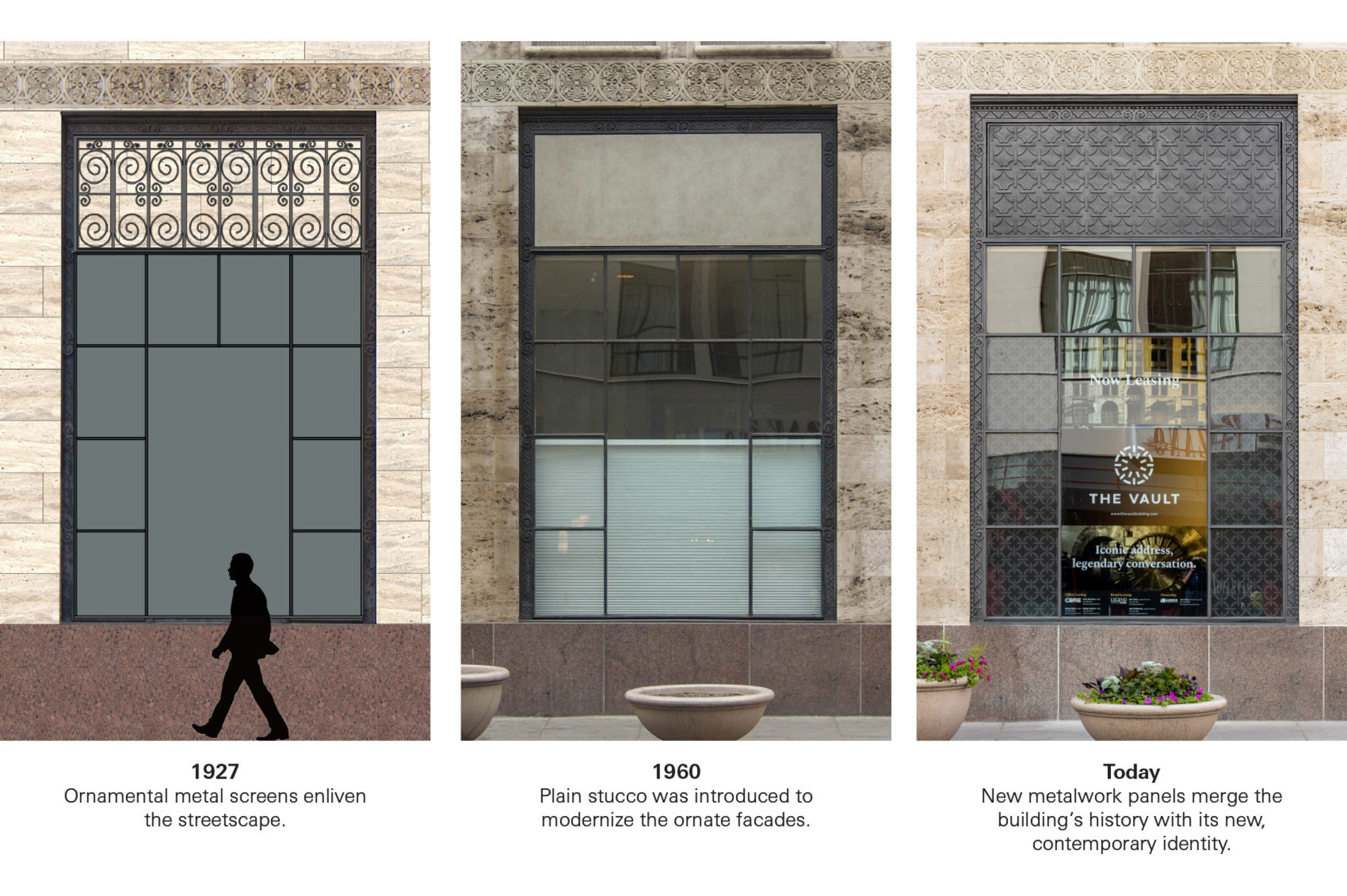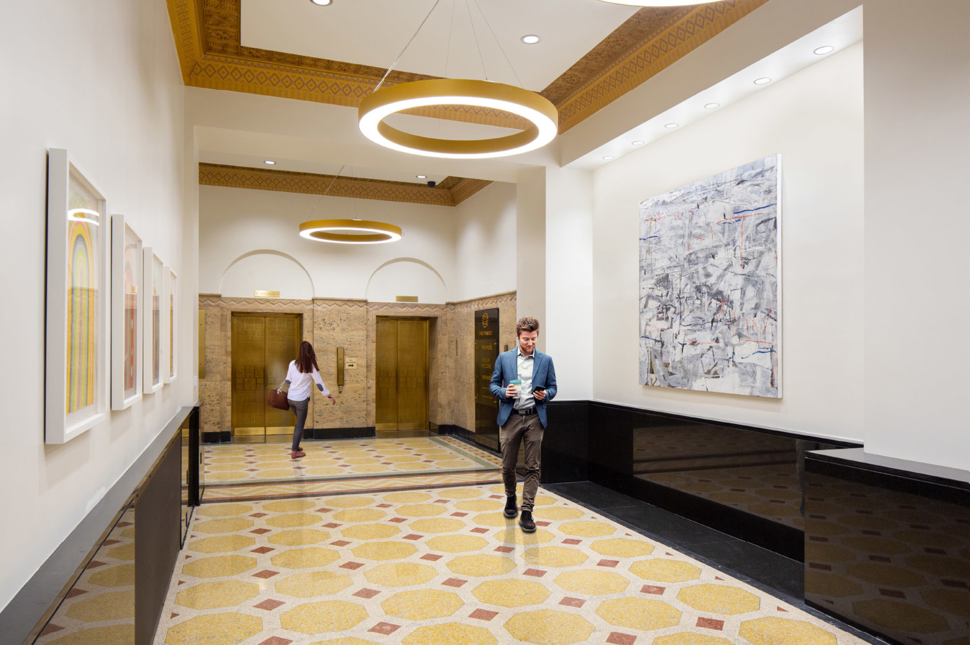 The interiors renovation pays homage to the building's history while adding new amenities and improvements for tenants